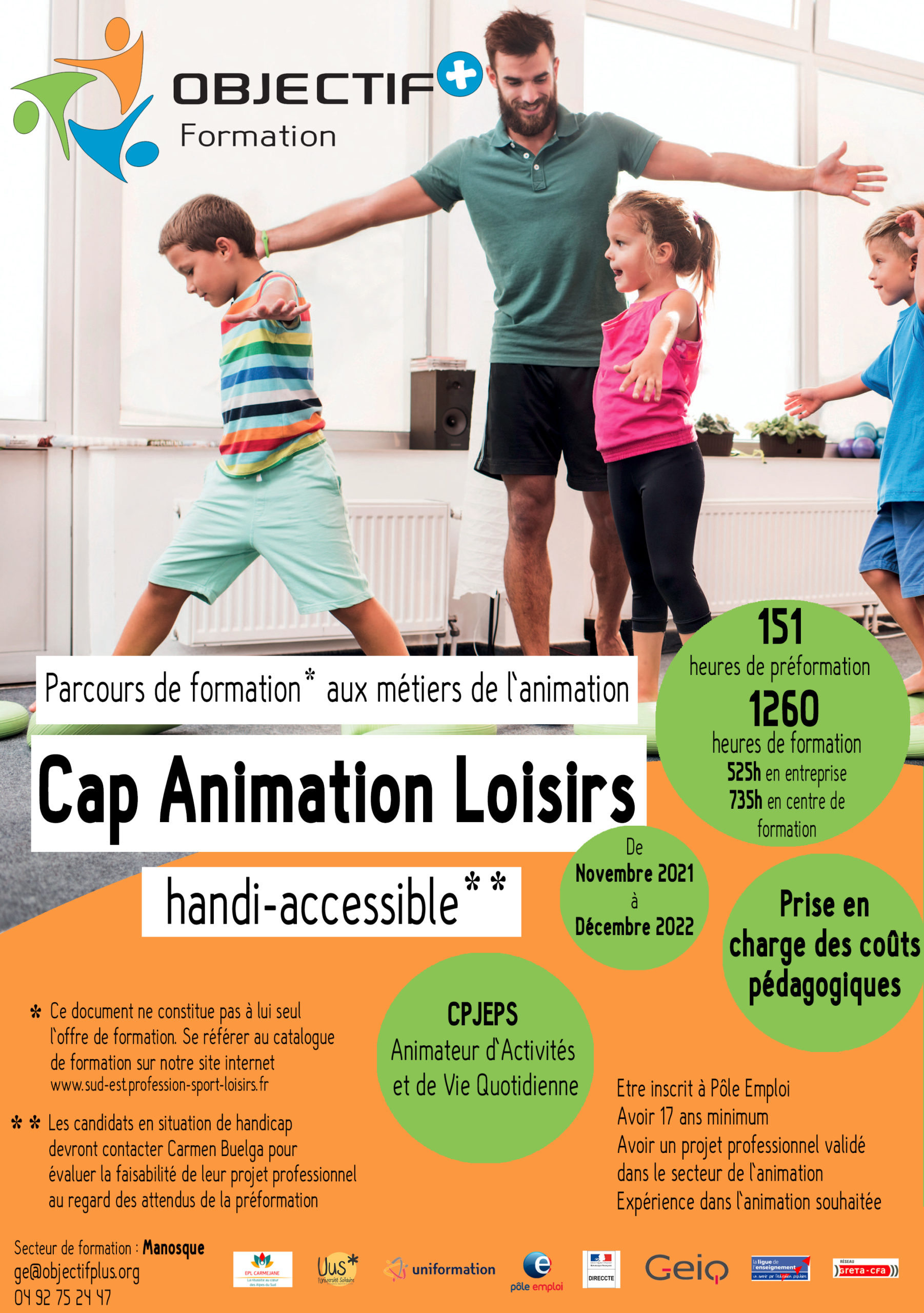 • La formation sera ensuite dispensée à Manosque (04) dans le cadre d’un contrat d’alternance. La formation préparera à l’obtention du CPJEPS Animateur d’Activités et de Vie Quotidienne (AAVQ)
