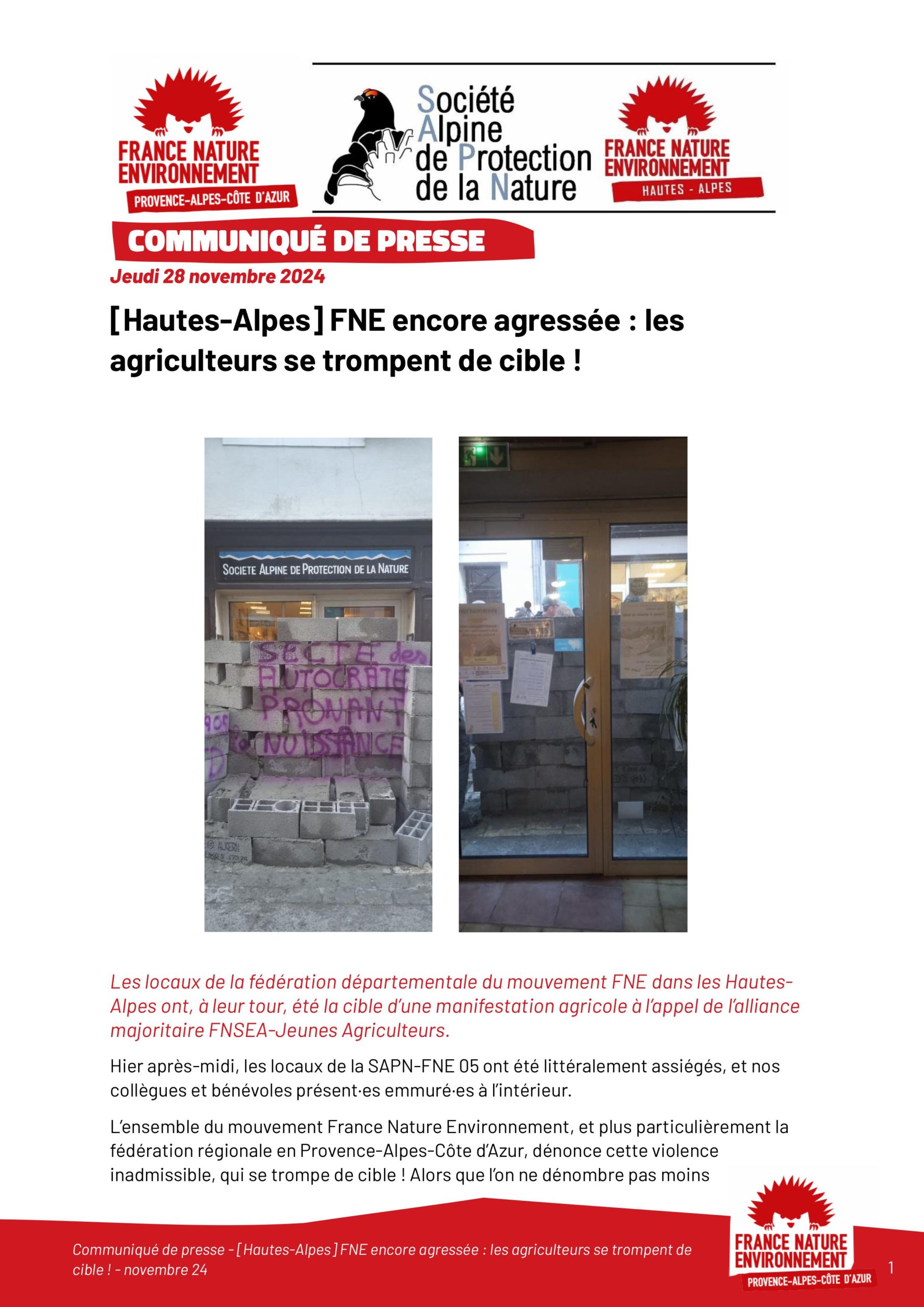 Dans le cadre de manifestations agricoles à GAP nos adhérents de la Société Alpine de Protection de la Nature (SAPN-FNE) ont dû subir de la part de certains syndicats agricoles (FNSEA ; Jeunes Agriculteurs…) des actes de violence et d’agressivité ; ces attaques inadmissibles se sont traduites de la manière suivante : locaux assiégés, tagués ; salariés et bénévoles emmurés au sein de ceux-ci.