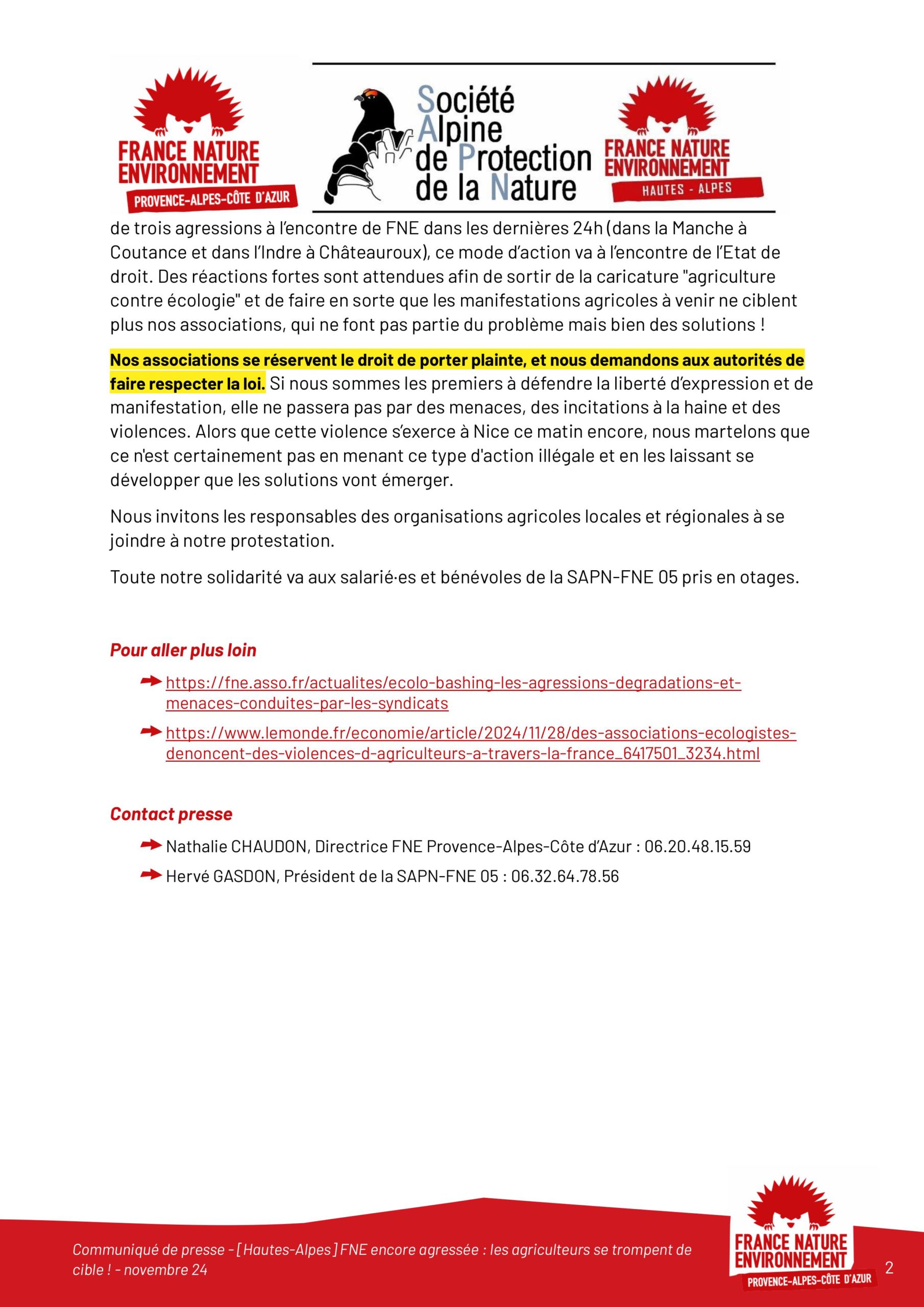 En conséquence et parce que nos associations valent mieux que d’être des boucs émissaires pris à partie parce que nous aurions exprimé des points de vue pertinents en toute liberté d’expression, nous dénonçons les actions menées à l’encontre de nos adhérents FNE et les assurons de notre soutien entier et total suite aux pressions et actes inqualifiables subis.