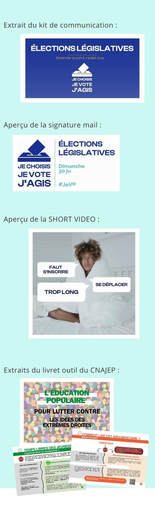 NOUVEAU ➔ télécharger le kit de mobilisation de "L'Art est public" VOTE AVEC TON COEUR PLUTOT QU'AVEC TES PEURS 💗NOUVEAU ➔ télécharger le kit vidéo pour les réseaux sociaux du Pacte de Pouvoir d'Agir, réalisé par Oxfam, pour MOBILISER LES HESITANT·ES➔ télécharger le KIT DE COMMUNICATION➔ télécharger la signature mail➔ télécharger la SHORT VIDEO sans logo à publier sur vos sites et réseaux➔ Un livret outil pour lutter contre les idées des extrêmes droites, par le CNAJEP➔ Les visuels "Le RN a voté" pour publication sur les réseaux sociaux de Eclaireurs Eclaireuses de France (EEDF)