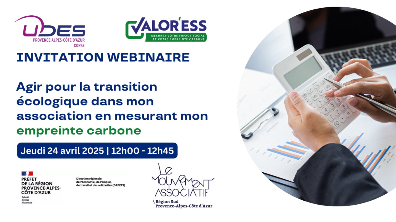 Le Mouvement Associatif Provence-Alpes-Côte d’Azur et L’UDES vous invite à participer à un webinaire pour découvrir une formation à la transition écologique et l’outil VALOR’ESS, un calculateur carbone gratuit spécialement conçu pour les structures de l’ESS. Cet outil vous permet de réaliser un premier bilan de vos émissions de gaz à effet de serre et d’élaborer un plan d’action concret pour réduire votre impact environnemental.